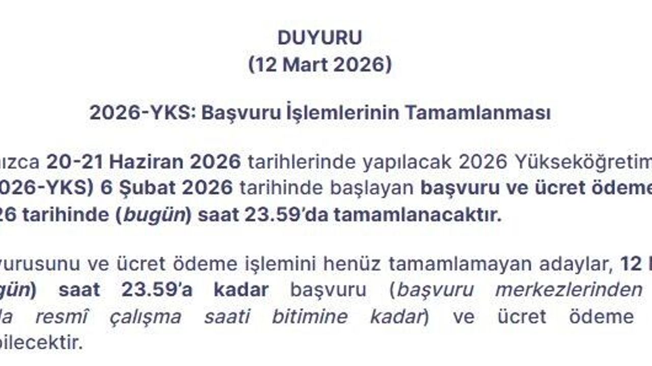 MEB tarafından 20-21 Haziran tarihlerinde yapılacak 2026 Yükseköğretim Kurumları Sınavı'na (2026-YKS) 6 Şubat tarihinde başlayan başvuru ve ücret ödeme işlemleri, bugün saat 23.59'da tamamlanacak.