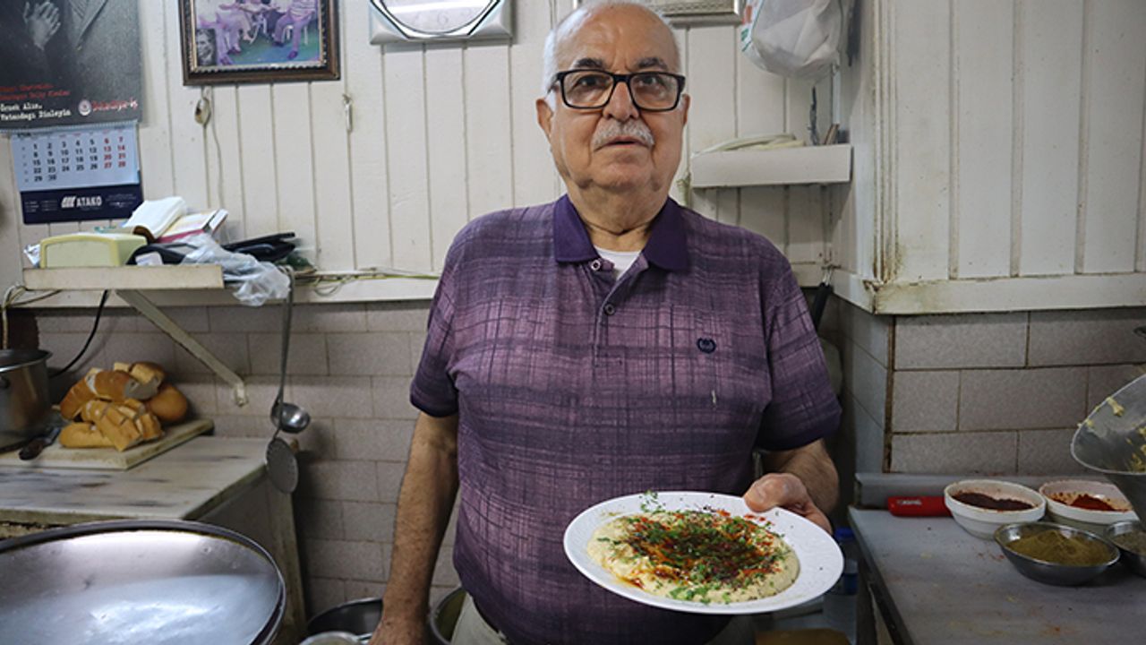 Mersin’de Fıkralı Humus ve Paça Salonu’nun işleterek döverek hazırlanan humusu en lezzetli haliyle sevenlerine sunan Ali Dağtekin, 57 yıldır bu mesleği yapıyor.