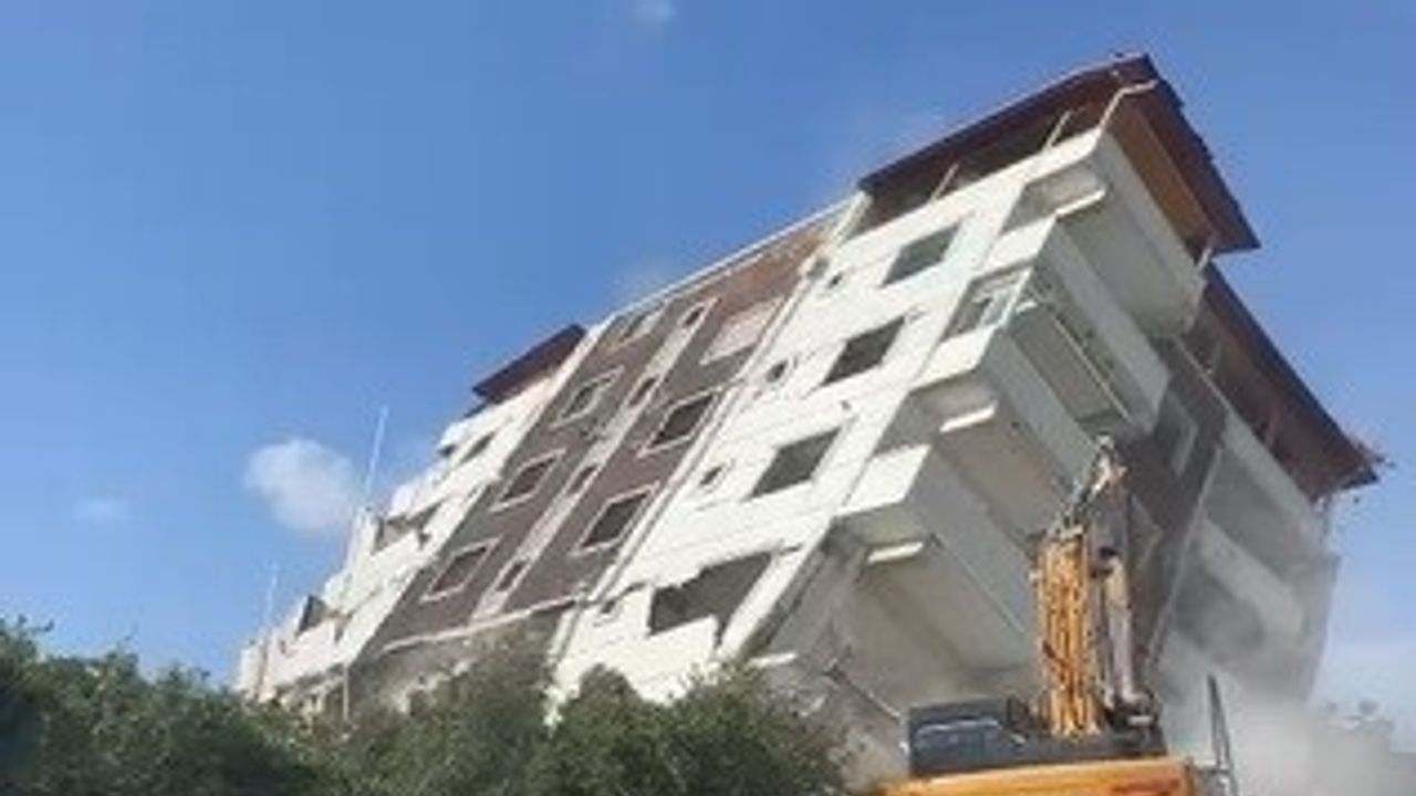 Hatay’ın Defne ilçesinde 7 katlı binanın iş makinesinin darbesiyle yerle bir olduğu anlar kameraya yansıdı.