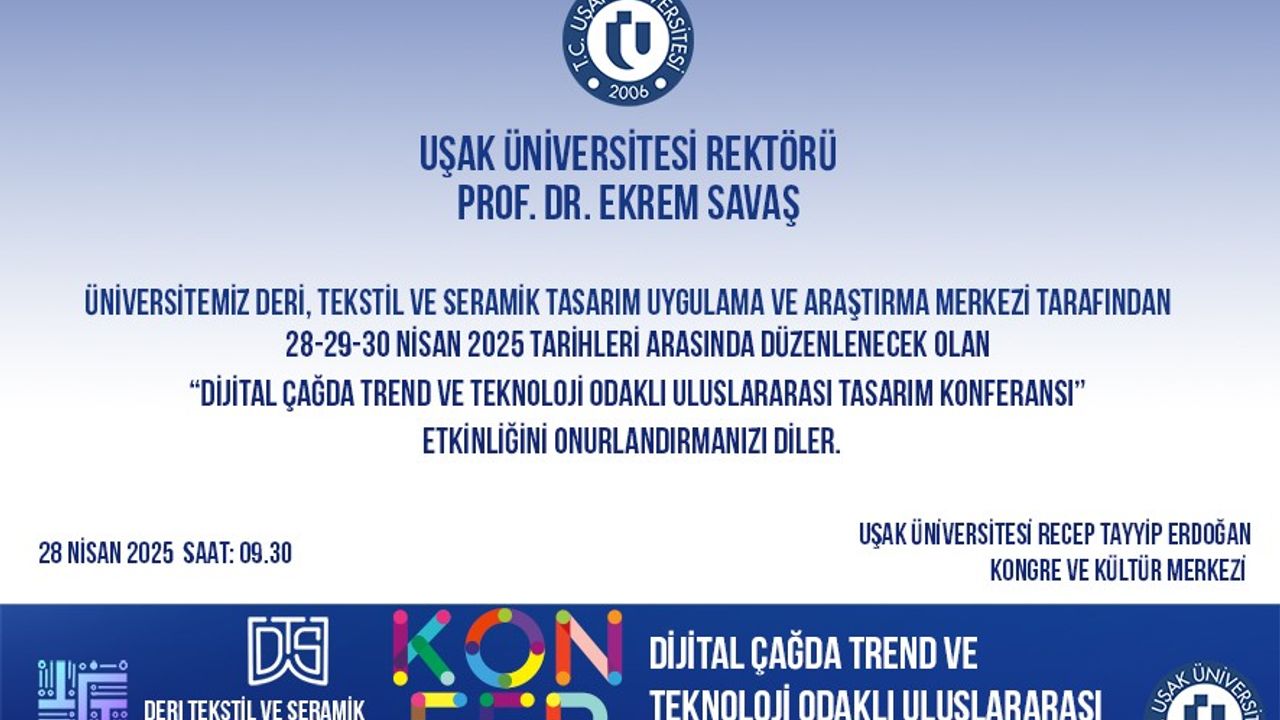 Uşak Üniversitesi Deri, Tekstil ve Seramik (DTS) Tasarım Uygulama ve Araştırma Merkezi, 28-29-30 Nisan 2025 tarihlerinde "Dijital Çağda Trend ve Teknoloji Odaklı Uluslararası Tasarım Konferansı" ile tasarım dünyasının nabzını tutacak. 3 gün sürecek konferansta, dijitalleşme ve trend odaklı dönüşüm süreci farklı yönleriyle ele alınacak.