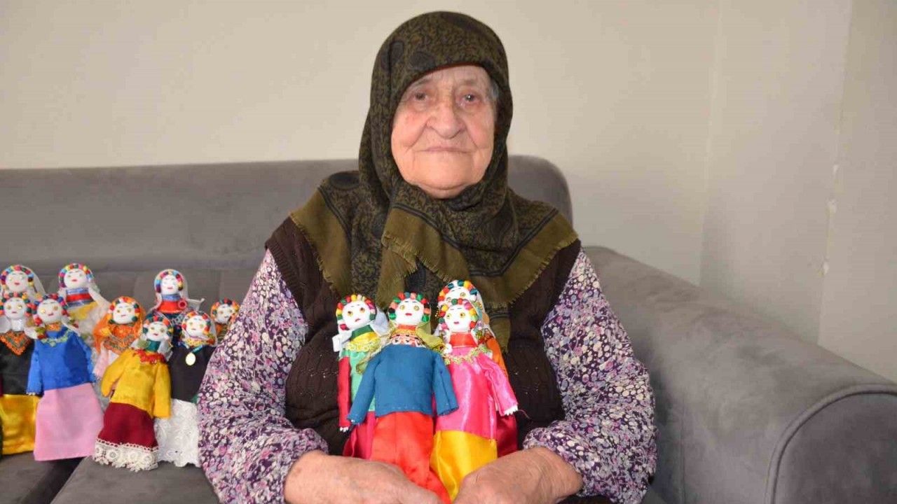 Deprem bölgesi Adıyaman’dan ailecek Bilecik’e geldiklerini anlatan 93 yaşındaki Şerife Demirkol, "Ben bu bebekleri çocukluğumda 12 yaşımda öğrendim ve daha sonra da yapmaya başladım, ne zaman nişanlandım evlendim o zaman bu bebekleri yapmayı bıraktım. Benim gençliğimde iş çoktu o yüzden bırakmak zorunda kaldım. Benim oğlum en küçük torunuma oyuncak bebek getirmişti. Dedim ki; benim zamanımda böyle bebekler yoktu. Bizim zamanımızda oyuncak bebekleri biz yapardık. Sonra oğlum dedi ki; ben sana değnek (dal) bulsam yapabilir misin anne? Değnek olsa yaparım dedim ve sonra gitti bu değneği getirdi. Bu sefer de başladım değneklerle bez bebek yapmaya. Artık yaşlandık oturuyorum canım sıkılıyor bende bu bebekleri yapıyorum. Benim çocuklarım diyor yapma kızlar razı olmuyor, senin gözlerin ağrıyor. Beş sene içinde 300 tane 500 tane yaptım, çocuklara veriyorum, oğluma diyorum ki dostlarına ver, sonra bu bebekleri torunlara dağıtıyorum. Kimseye parayla satmıyorum, herkese bu bebeklerden ücretsiz veriyorum. Ayrıca bu bebekleri gelinlerin bohçasına veriyorum, çocuklara veriyorum ama çocuklar tez dağıtır, o yüzden diyorum ki; kime veriyorsam bu bebekleri size hatıra kalsın" dedi.