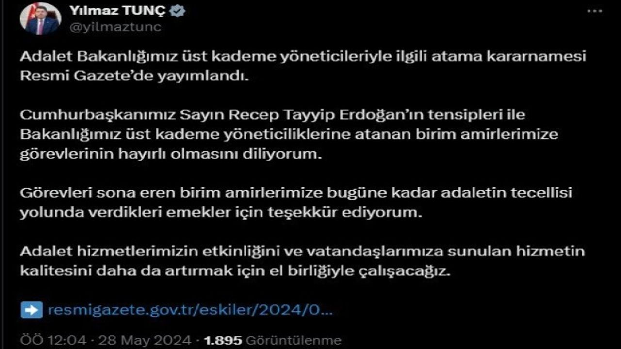 Resmi Gazete’de yayımlanan Adalet Bakanlığı üst kademe yöneticileriyle ilgili atama kararları, "Teftiş Kurulu Başkanı Cihan Yıldız, Ceza İşleri Genel Müdürü Mehmet Yılmaz, Hukuk İşleri Genel Müdürü Hakan Öztatar, Mevzuat Genel Müdürü Mehmet Ökmen, Ceza ve Tevkifevleri Genel Müdürü Enis Yavuz Yıldırım, Adli Sicil ve İstatistik Genel Müdürü Günay Albayrak, Dış İlişkiler ve Avrupa Birliği Genel Müdürü Ömer Serdar Atabey, Personel Genel Müdürü Turan Kuloğlu, Hukuk Hizmetleri Genel Müdürü Serdar Ateş, Bilgi İşlem Genel Müdürü Servet Gül, Strateji Geliştirme Başkanı Tahir Hırslı, İnsan Hakları Dairesi Başkanı Abdullah Aydın ve İcra İşleri Daire Başkanı Hasan Özçelik" şeklinde açıklındı.