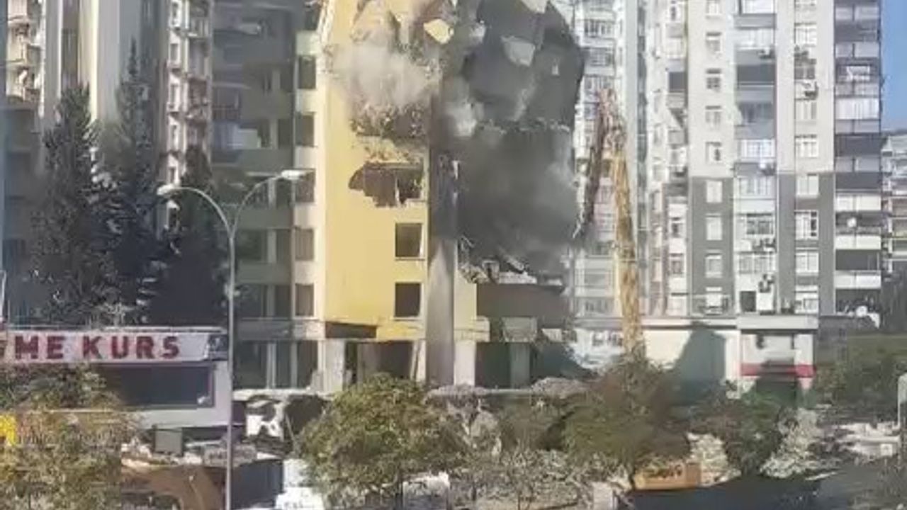 Adana’nın Çukurova ilçesinde, 6 Şubat 2023’teki depremlerde ağır hasar alan bina kontrollü şekilde yıkıldı.