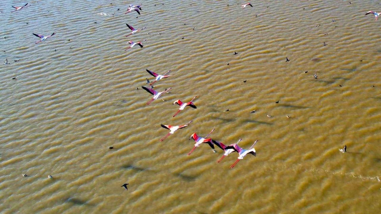 Soğuk kış günlerinde donmuş göllerden kaçan flamingolar, Adana’nın Karataş ilçesindeki Akyatan Lagünü’nde konaklıyor. İnce bacaklı, uzun eğri bir boyuna ve renkli tüylere sahip binlerce flamingo lagünde görsel şölen sunuyor.