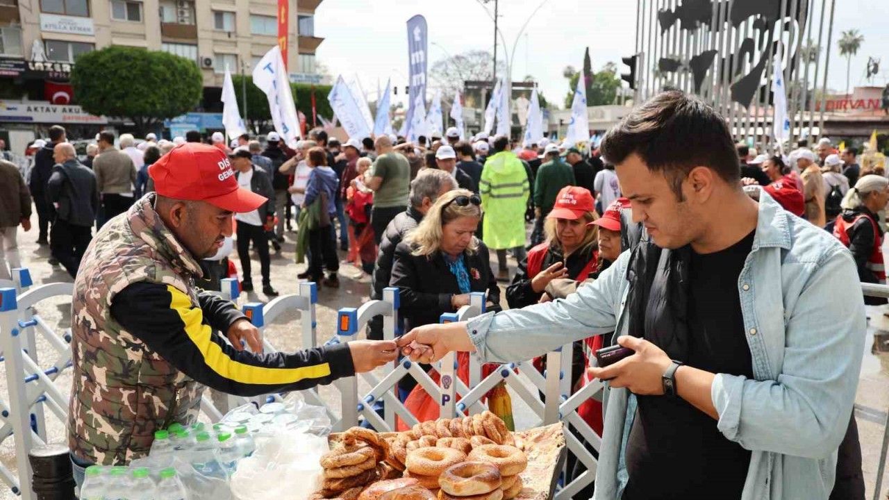 Adana’da 1 Mayıs Emek ve Dayanışma Günü’nde kutlama yapılırken ekmek parası için alanlara gelen simitçiler ise bariyerlerin arkasında çalışmaya devam etti.