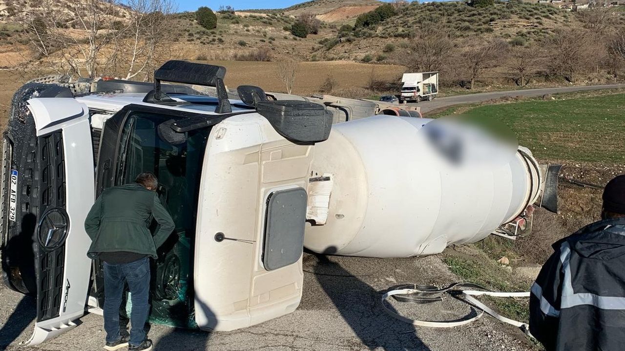 Adıyaman’da, sürücüsünün direksiyon hakimiyetini kaybettiği beton mikseri devrildi.