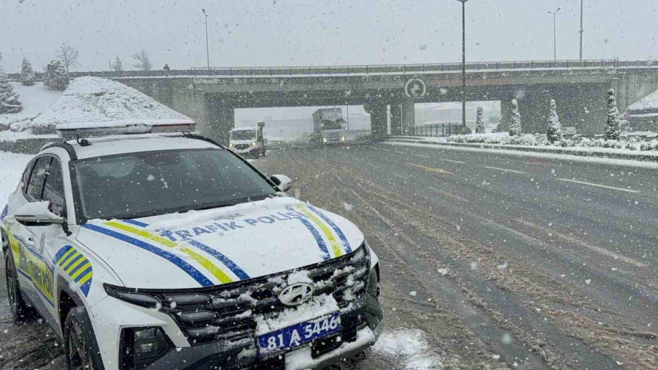 Düzce’de polis ekipleri tedbirlerini alarak araçları uyarırken yollarda kalanlar kepçe ile kurtarıldı.