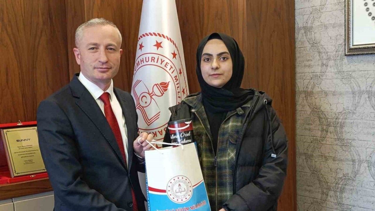 Ağrı İl Milli Eğitim Müdürü Hasan Kökrek, "Okulum Beni Bekler" projesi kapsamında başarılı bir şekilde eğitimini sürdüren Semerkant Mesleki ve Teknik Anadolu Lisesi 9. sınıf öğrencisi Zeynep Erçek’i makamında kabul ederek ödüllendirdi.