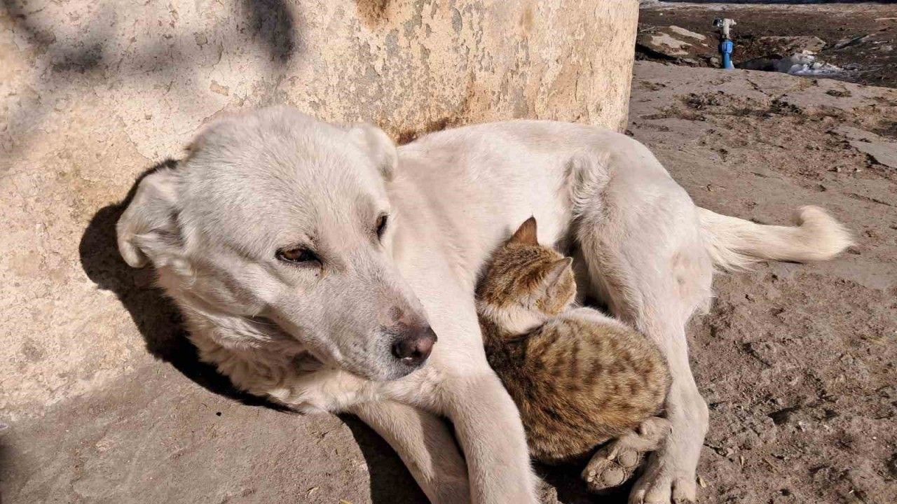 Kars’ın Akyaka ilçesinde insanların içini ısıtan dostluk kameralara yansıdı. Soğuk kış günlerinin hakim olduğu kentte bir kedi ve köpeğin samimi arkadaşlığı görenleri şaşırttı.