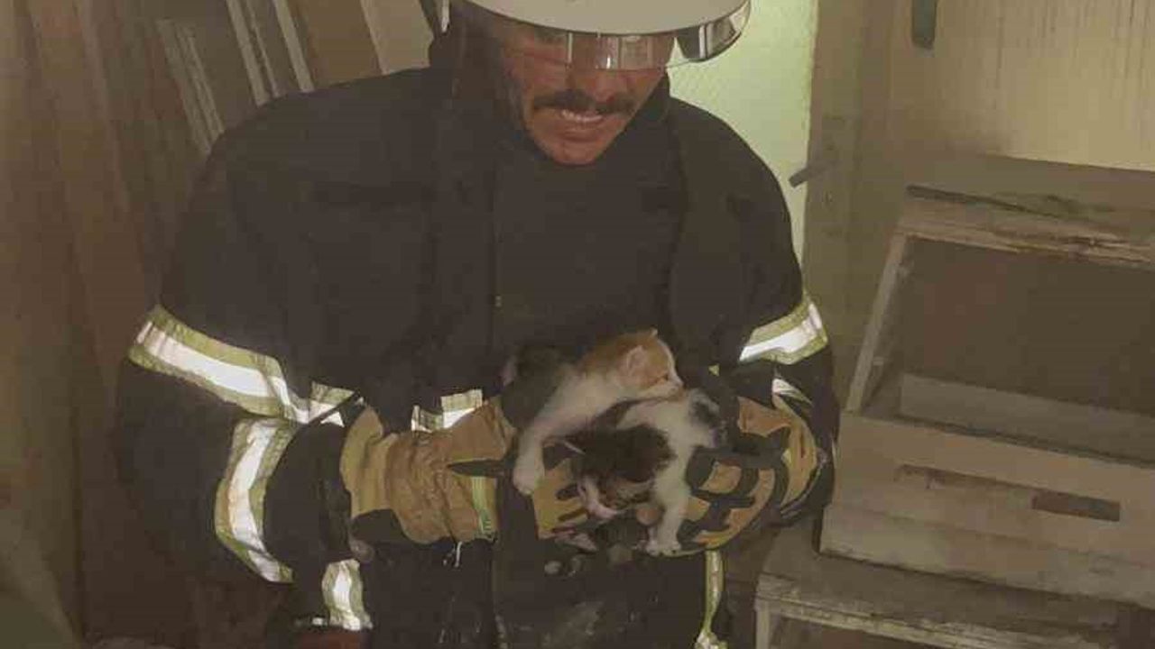 Hatay’da alevlere teslim olan metruk binadan mahsur kalan yavru kediler, miyavlamaları üzerine itfaiye ekipleri tarafından fark edilerek kurtarıldılar.