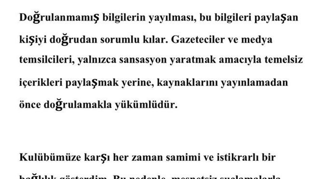 Sarı-lacivertli futbolcu, sosyal medya hesabından yaptığı paylaşımda, "Şu anda yayılmakta olan ve beni haksız şekilde suçlayan bir video hakkında açık bir yalanlama da bulunmak istiyorum. Gerçek bağlamından koparılmış ve çarpıtılmış bu içerik onuruma zarar vermekte ve imajıma ciddi şekilde gölge düşürmektedir. Doğrulanmamış bilgilerin yayılması bu bilgileri paylaşan kişiyi doğrudan sorumlu kılar. Gazeteciler ve medya temsilcileri yalnızca sansasyon oluşturmak amacıyla temelsiz içerikleri paylaşmak yerine, kaynaklarını yayınlamadan önce doğrulamakla yükümlüdür.