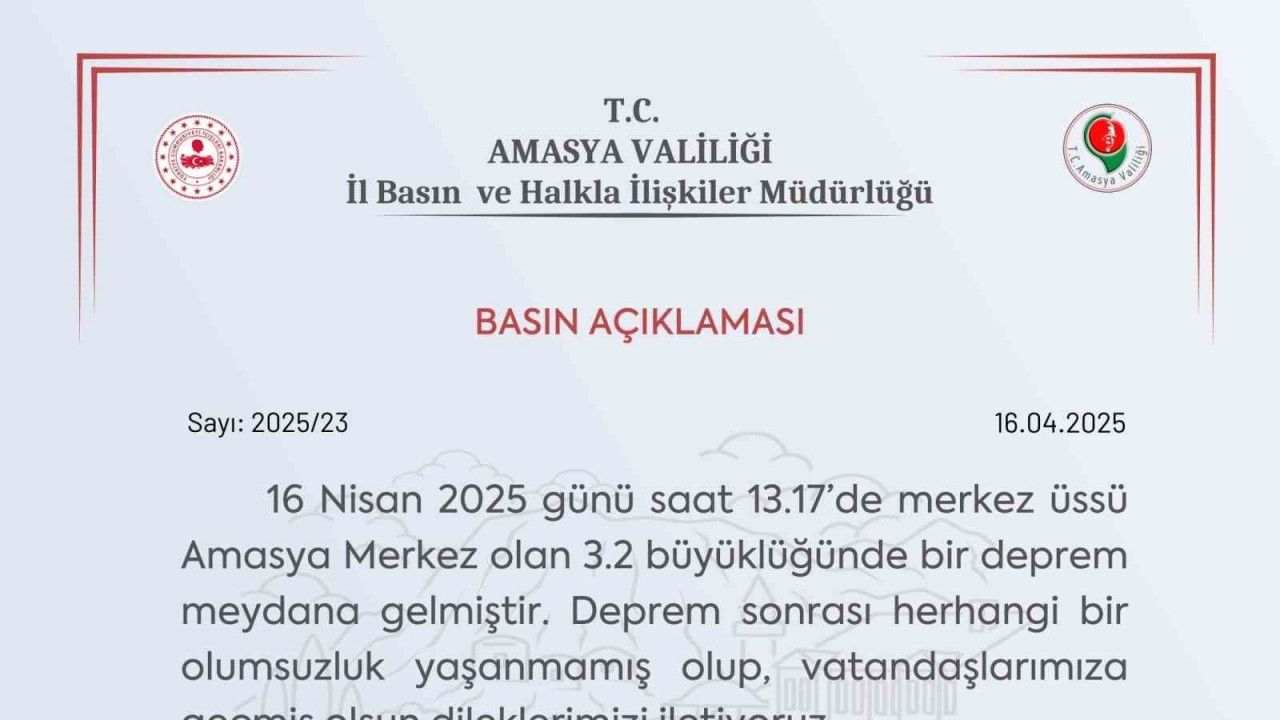 Valilikten yapılan açıklamada, "16 Nisan 2025 günü saat 13.17’de merkez üssü Amasya Merkez olan 3.2 büyüklüğünde bir deprem meydana gelmiştir. Deprem sonrası herhangi bir olumsuzluk yaşanmamış olup, vatandaşlarımıza geçmiş olsun dileklerimizi iletiyoruz" denildi.