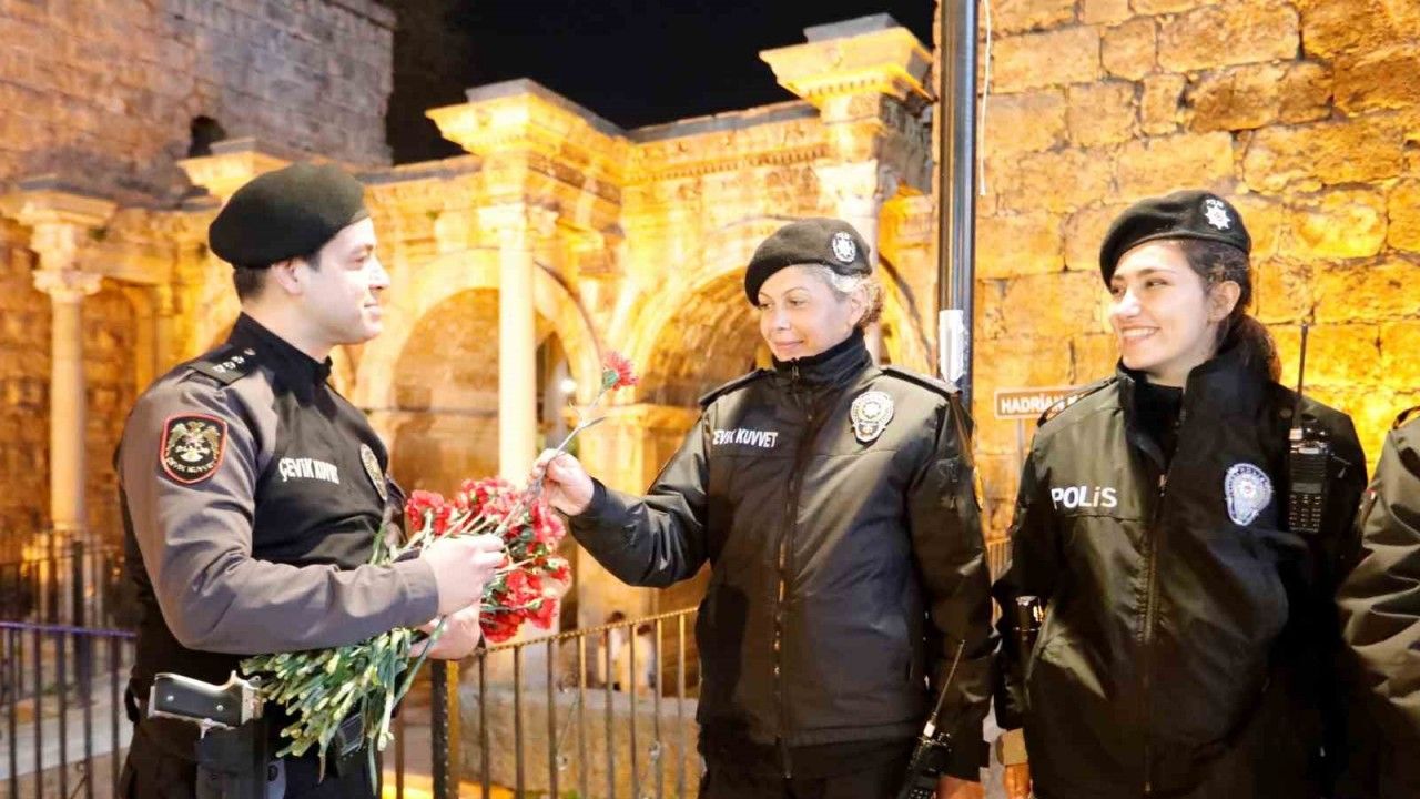 Antalya’da 8 Mart Dünya Kadınları Günü nedeniyle düzenlenen etkinlik ve programlarda görev alan kadın polislere müdür ve amirleri tarafından karanfil vererek Kadınlar Günü’nü kutladı.