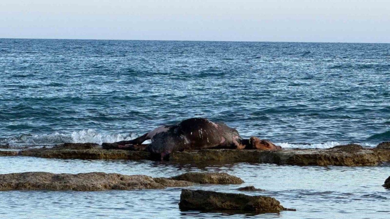 Antalya’nın Manavgat ilçesinde denize girmek isteyen vatandaşlar, denizin ortasındaki kayalıkların üzerinde inek leşi görünce durumu yetkililere bildirdiler.