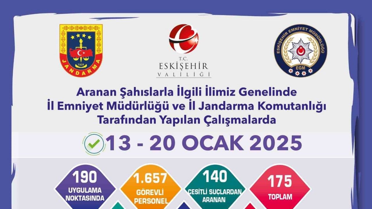 Edinilen bilgilere göre, Eskişehir İl Emniyet Müdürlüğü ve İl Jandarma Komutanlığı ekiplerince aranan şahıslarla ilgili çalışma yapıldı. İl genelinde 13-20 Ocak 2025 tarihleri arasında gerçekleştirilen çalışmalarda, 190 uygulama noktasında bin 657 personel görevlendirildi. Ekiplerin çalışmaları sonucunda; çeşitli suçlardan aranan 140 şahıs, 5 yıla kadar aranan 27 şahıs, 5 ila 10 yıla kadar aranan 6 şahıs, 10 yıl ve üzeri aranan 2 şahıs olmak üzere toplam 175 şahsın yakalandığı öğrenildi.