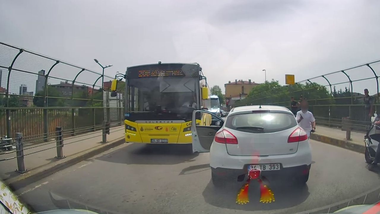 Ataşehir’de trafikte iki sürücü arasında çıkan tartışma bıçaklı saldırıya dönüştü. Saldırıdan yangın tüpü sıkarak kurtulan sürücünün o anları araç kamerasına yansıdı.