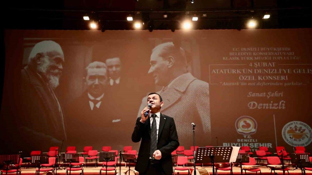 Denizli Büyükşehir Belediyesi Konservatuvarı Türk Müziği Topluluğu tarafından seslendirilen ve Atatürk’ün Denizli’ye gelişinin anısına düzenlenen "Atatürk’ün Sevdiği Şarkılar Konseri", Nihat Zeybekci Kongre ve Kültür Merkezi’nde gerçekleştirildi. Programa Denizli Valisi Ömer Faruk Coşkun, Milletvekili Şeref Arpacı, Denizli Büyükşehir Belediye Başkanı Bülent Nuri Çavuşoğlu, Başkanvekili Ali Marım, CHP İl Başkanı Ali Osman Horzum çok sayıda davetli ve vatandaşlar katıldı. Şef Ahmet Nuri Çağdaş yönetimindeki konserde, Ulu Önder Mustafa Kemal Atatürk’ün en sevdiği şarkılar seslendirildi. Denizlililerin yoğun ilgi gösterdiği gecede duygusal anlar yaşanırken Vali Coşkun ve Başkan Çavuşoğlu programın sonunda Şef Ahmet Nuri Çağdaş’a plaketini takdim etti.