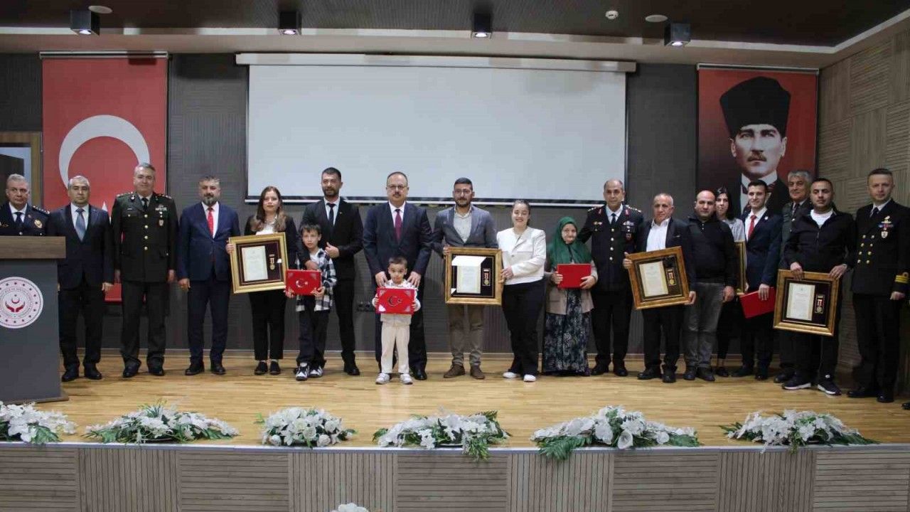 Vali Canbolat, konuşmasının ardından Cumhurbaşkanı Recep Tayyip Erdoğan’ın adına 4 gazi ve 1 şehit yakınına Devlet Övünç Madalyası ve Beratı’nı takdim etti.
