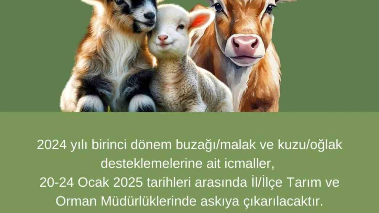 Konuyla ilgili Aydın İl Tarım ve Orman Müdürlüğü’nden yapılan açıklamada, "2024 yılı birinci dönem buzağı/malak ve kuzu/oğlak desteklemelerine ait icmaller 20 - 24 Ocak 2025 tarihleri arasında İl/İlçe Tarım ve Orman Müdürlüklerinde askıya çıkarılacaktır. Askı listelerinde, kendinize ait destekleme bilgilerini mutlaka kontrol ediniz ve varsa hataları düzelttirmeyi unutmayınız" ifadelerine yer verildi.