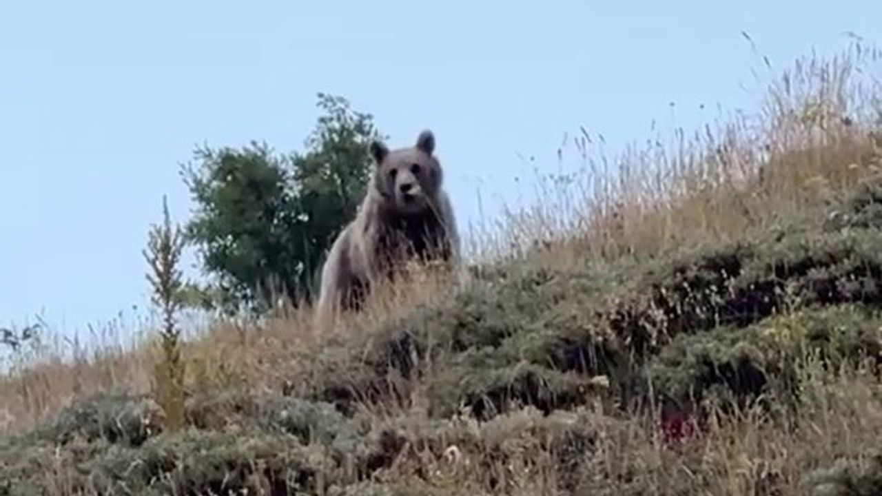 Erzurum’un Aziziye ilçesi Aşağı Akyazı köyünde hayvanlarını otlatan Soner Kaplan, bir anda ayı ile karşılaştı. Çoban, hayretinin ardından bir yandan elindeki cep telefonu ile ayıyı görüntülerken bir yandan da bağırarak onu korkutup kaçırmaya çalıştı. Ayı bir süre çobana baktıktan sonra kaçarak izini kaybettirdi.