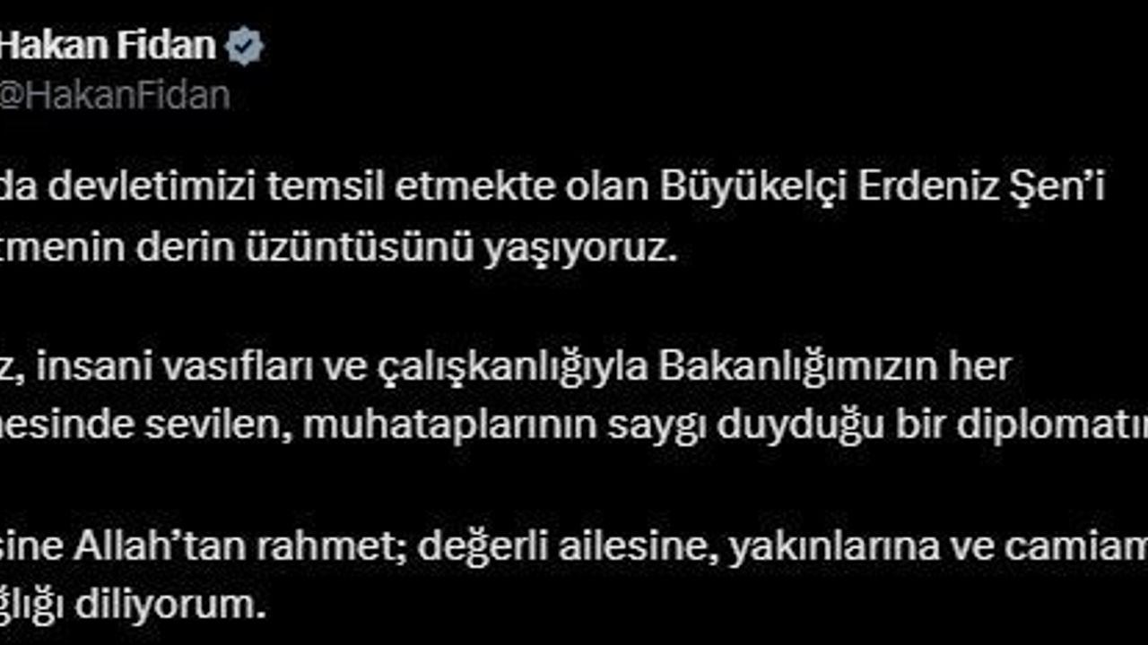 Dışişleri Bakanı Hakan Fidan sosyal medya hesabından yaptığı paylaşımda, Malta’da Türkiye’yi temsil etmekte olan Büyükelçi Erdeniz Şen’i kaybetmenin üzüntüsünü yaşadığını belirtti. Bakan Fidan paylaşımında, "Erdeniz, insani vasıfları ve çalışkanlığıyla Bakanlığımızın her kademesinde sevilen, muhataplarının saygı duyduğu bir diplomatımızdı. Kendisine Allah’tan rahmet; değerli ailesine, yakınlarına ve camiamıza başsağlığı diliyorum" ifadelerine yer verdi.