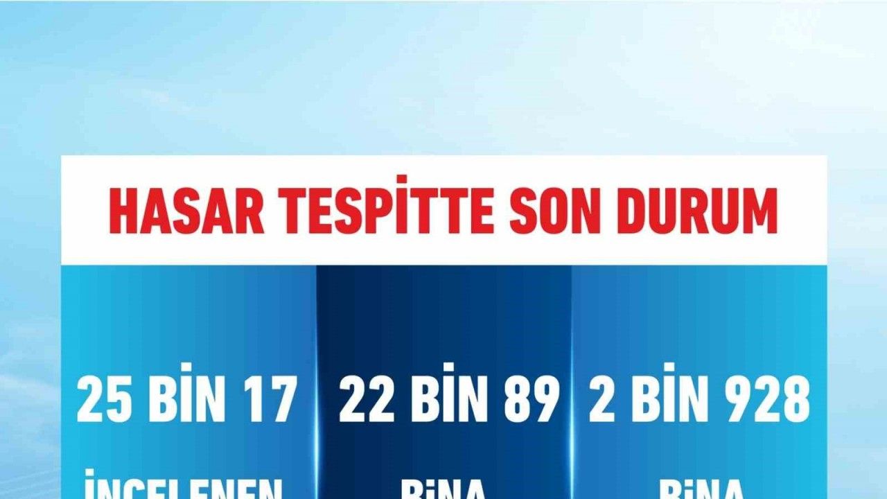 Çevre, Şehircilik ve İklim Değişikliği Bakanı Murat Kurum, "25 bin 17 binayı inceledik. 22 bin 89 binanın hasarsız, 2 bin 928 binanın az hasarlı olduğunu tespit ettik" dedi.