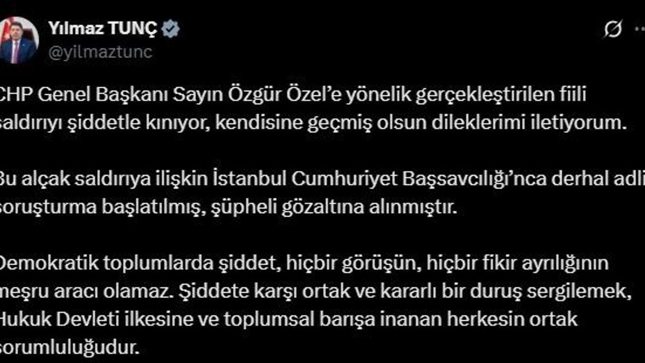 Adalet Bakanı Yılmaz Tunç, "CHP Genel Başkanı Özgür Özel’e yönelik gerçekleştirilen fiili saldırıyı şiddetle kınıyor, kendisine geçmiş olsun dileklerimi iletiyorum" dedi.