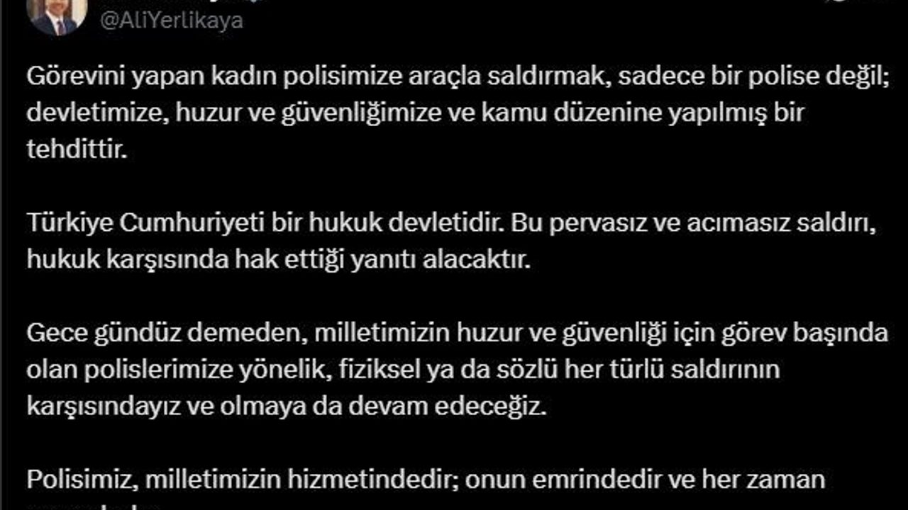 İçişleri Bakanı Ali Yerlikaya, 23 Nisan’da girilmesi yasak olan bölgeye girmek isteyen bir parti aracının kadın polisin "dur" ihtarına uymayarak üzerine sürmesine ilişkin, "Görevini yapan kadın polisimize araçla saldırmak sadece bir polise değil; devletimize, huzur ve güvenliğimize ve kamu düzenine yapılmış bir tehdittir. Türkiye Cumhuriyeti bir hukuk devletidir" dedi.