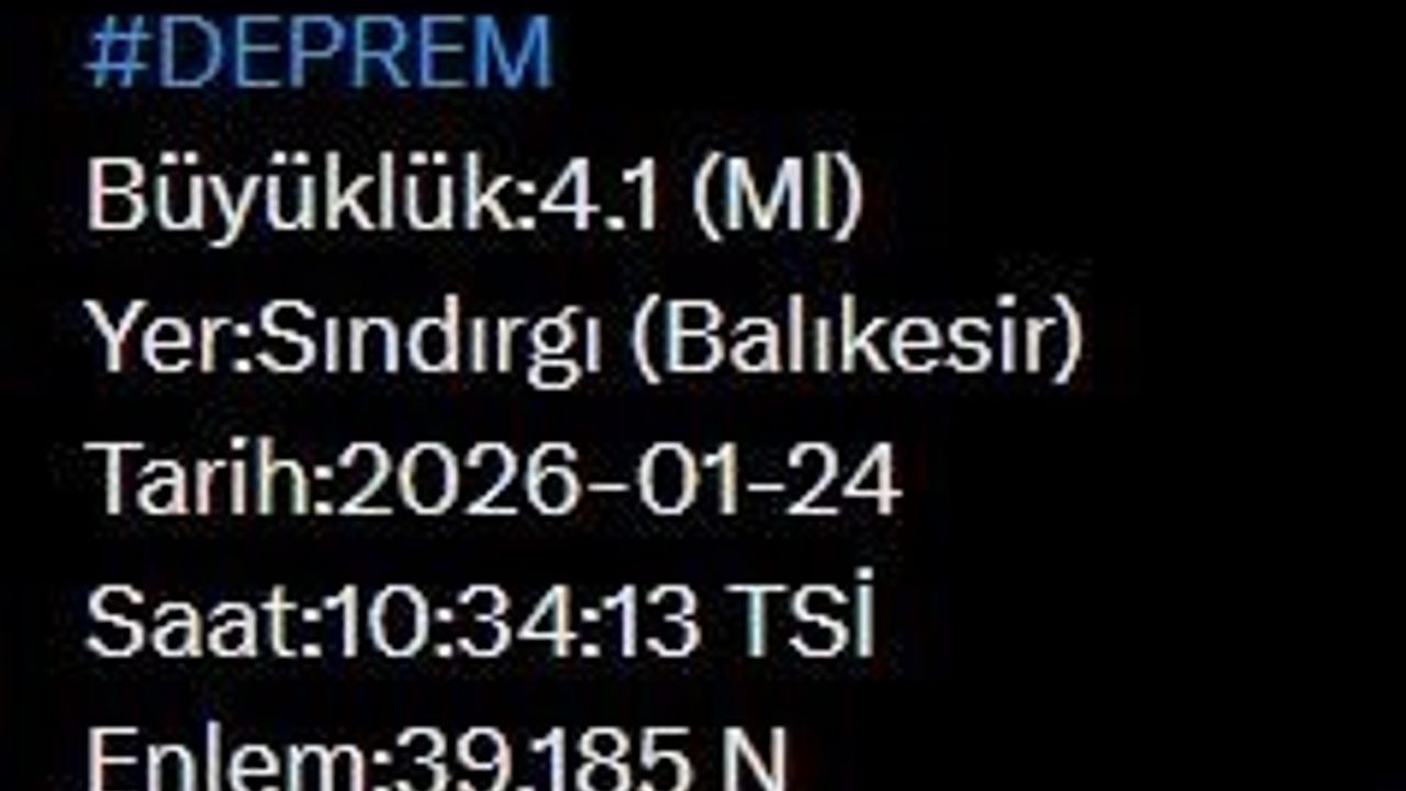 AFAD'ın paylaştığı bilgilere göre, Balıkesir'in Sındırgı ilçesinde saat 10.34'te 4.1 büyüklüğünde deprem meydana geldi. Merkezi Sındırgı olan depremin derinliği 10.73 kilometre olarak ölçüldü.