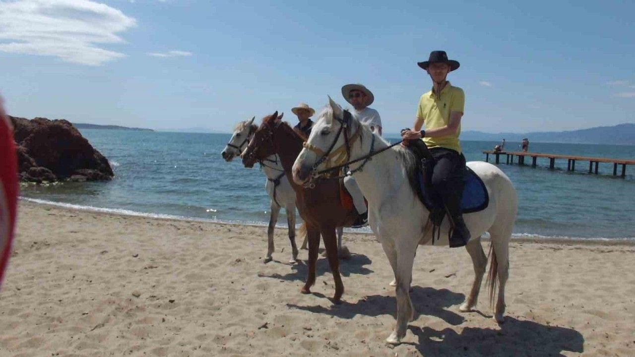 Burhaniye ilçesinde, deniz sezonu açılırken, sahile gelen 3 gencin Ören plajında sürdüğü atlar ilgi odağı oldu. Ata sporu olan biniciliği yaşatmak istediklerini kaydeden Taner Buyraz, fırsat buldukça plaja geldiklerini söyledi.