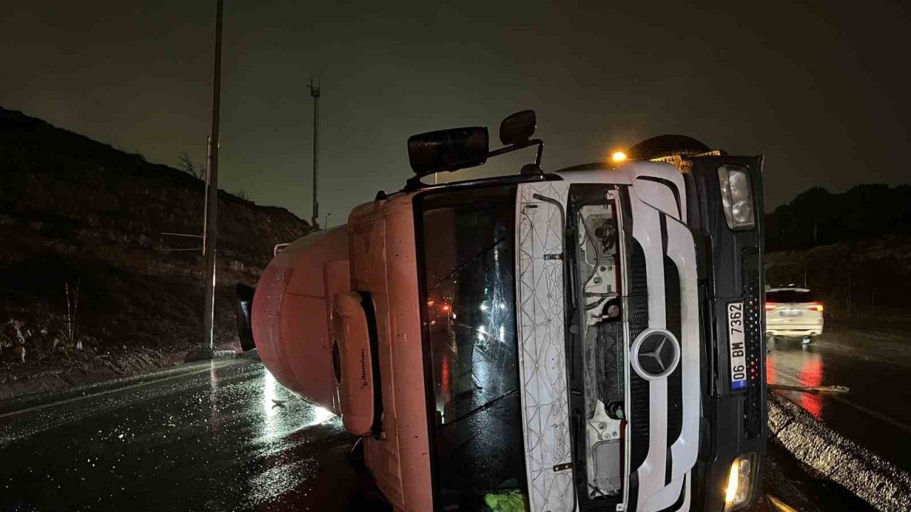 İstanbul Başakşehir’de yağışın etkisiyle kayganlaşan yolda devrilen beton mikserine arkadan gelen araç çarptı. Kazada beton mikseri sürücüsü hafif yaralandı.