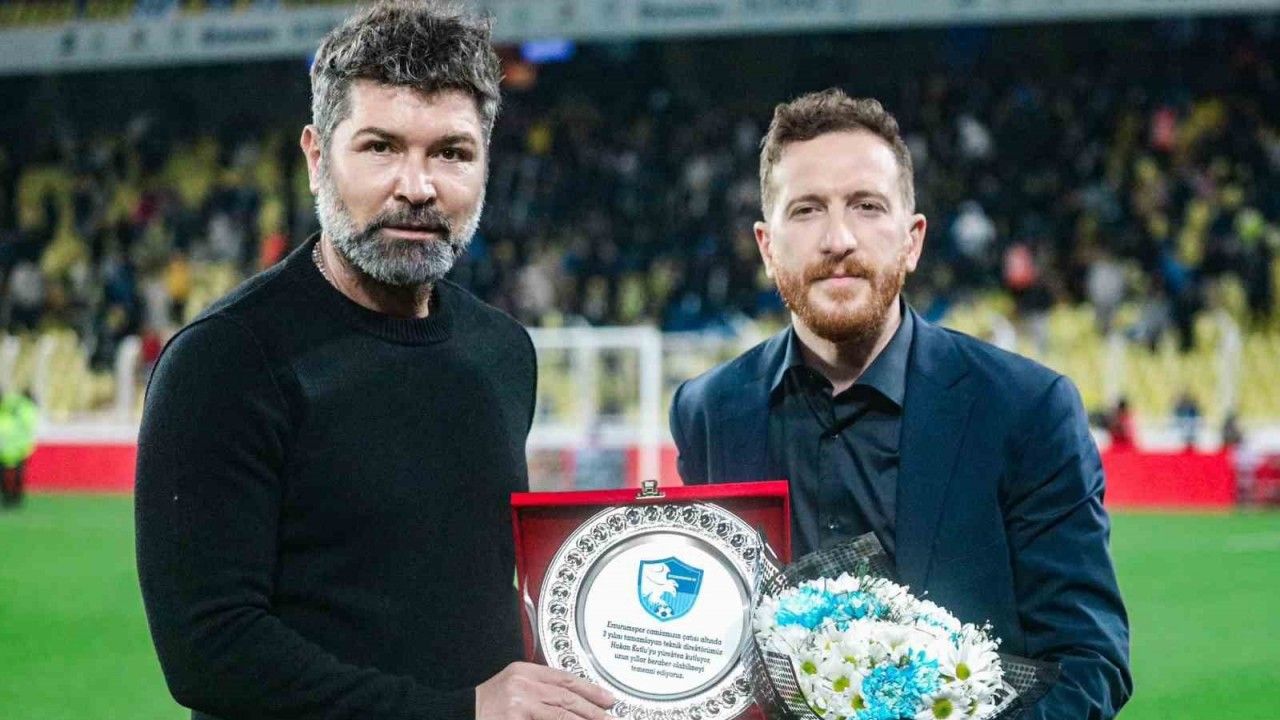 Erzurumspor FK Başkanı Ahmet Dal, kulüpte üçüncü yılını tamamlayan Teknik Direktör Hakan Kutlu’ya plaket verdi.