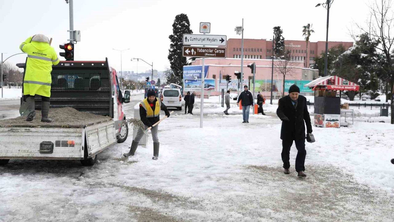 Hava sıcaklığının sıfırın altına düştüğü kentte Büyükşehir Belediyesi yollardaki yoğun mesaisini kaldırımlarda, meydanlarda ve yaya kullanımına açık tüm alanlarda sürdürüyor. Ekipler yaya sirkülasyonunun yoğun olduğu alanlara öncelik vererek 7/24 anlayışı ile mesai yapıyor. Yaya güzergâhlarında ekipler tarafından kar küreme, buz kazıma ve tuz-agrega çalışması gerçekleştiriliyor.