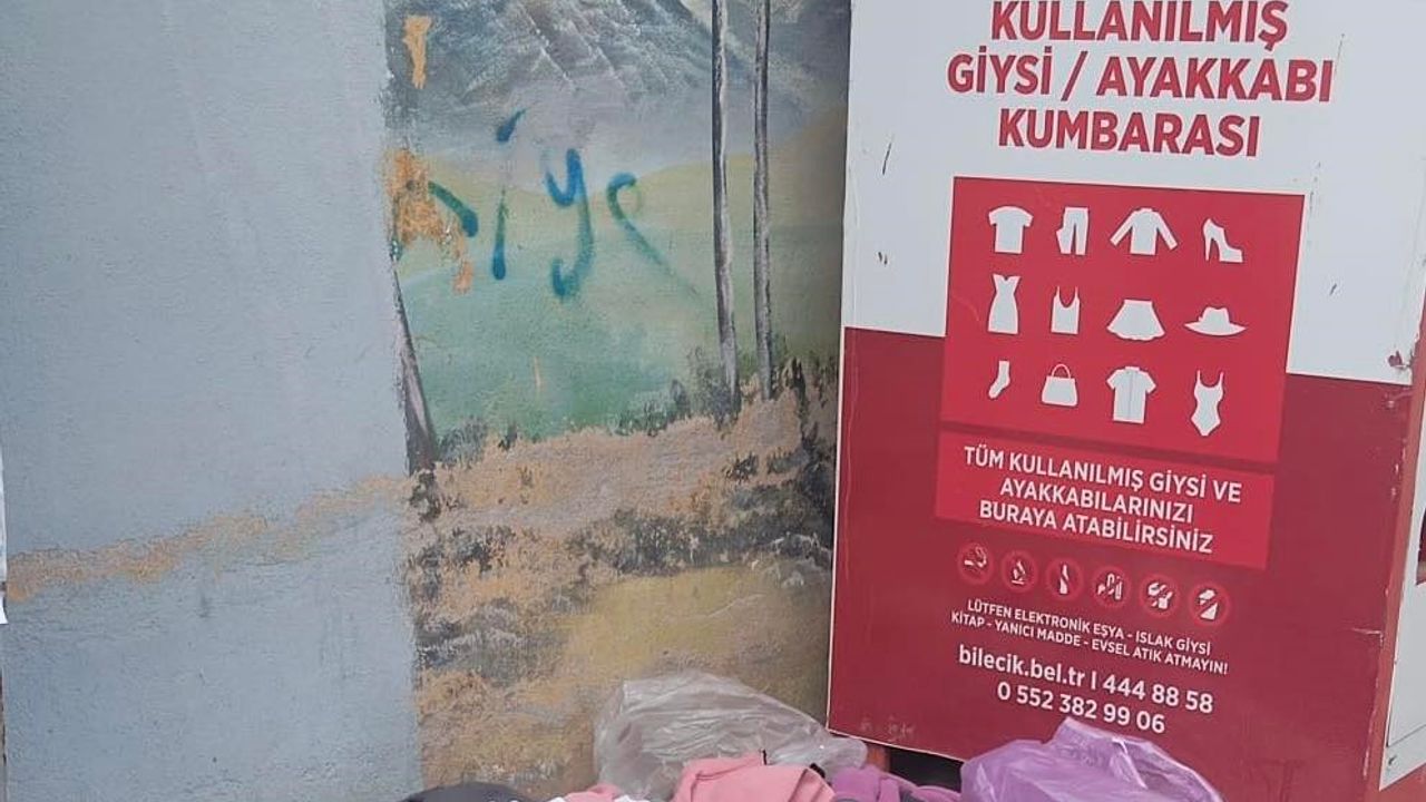 Geri dönüşümde kullanılmak üzere giysi ve ayakkabıların toplandığı bir kumbaranın önünde kıyafetlerin yere saçıldığı görüldü.