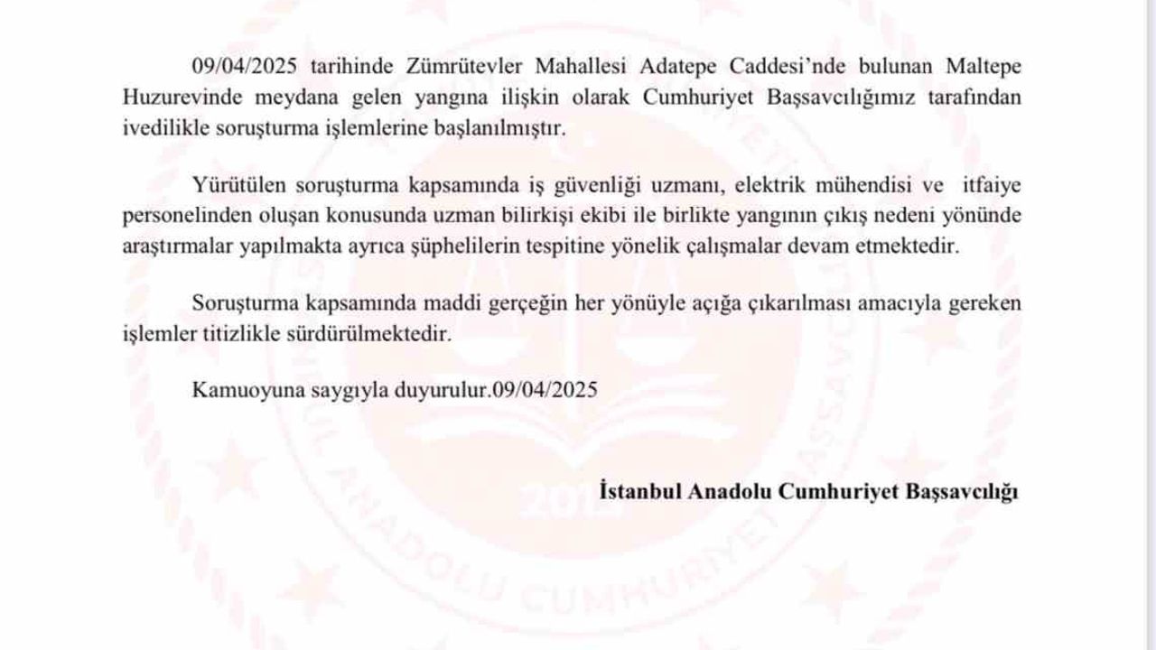 Yapılan açıklamada, "09/04/2025 tarihinde Zümrütevler Mahallesi Adatepe Caddesi’nde bulunan Maltepe Huzurevinde meydana gelen yangına ilişkin olarak Cumhuriyet Başsavcılığımız tarafından ivedilikle soruşturma işlemlerine başlanılmıştır. Yürütülen soruşturma kapsamında is güvenliği uzmanı, elektrik mühendisi ve itfaiye personelinden oluşan konusunda uzman bilirkişi ekibi ile birlikte yangının çıkış nedeni yönünde araştırmalar yapılmakta ayrıca şüphelilerin tespitine yönelik çalışmalar devam etmektedir. Soruşturma kapsamında maddi gerçeğin her yönüyle açığa çıkarılması amacıyla gereken işlemler titizlikle sürdürülmektedir" ifadeleri kullanıldı.