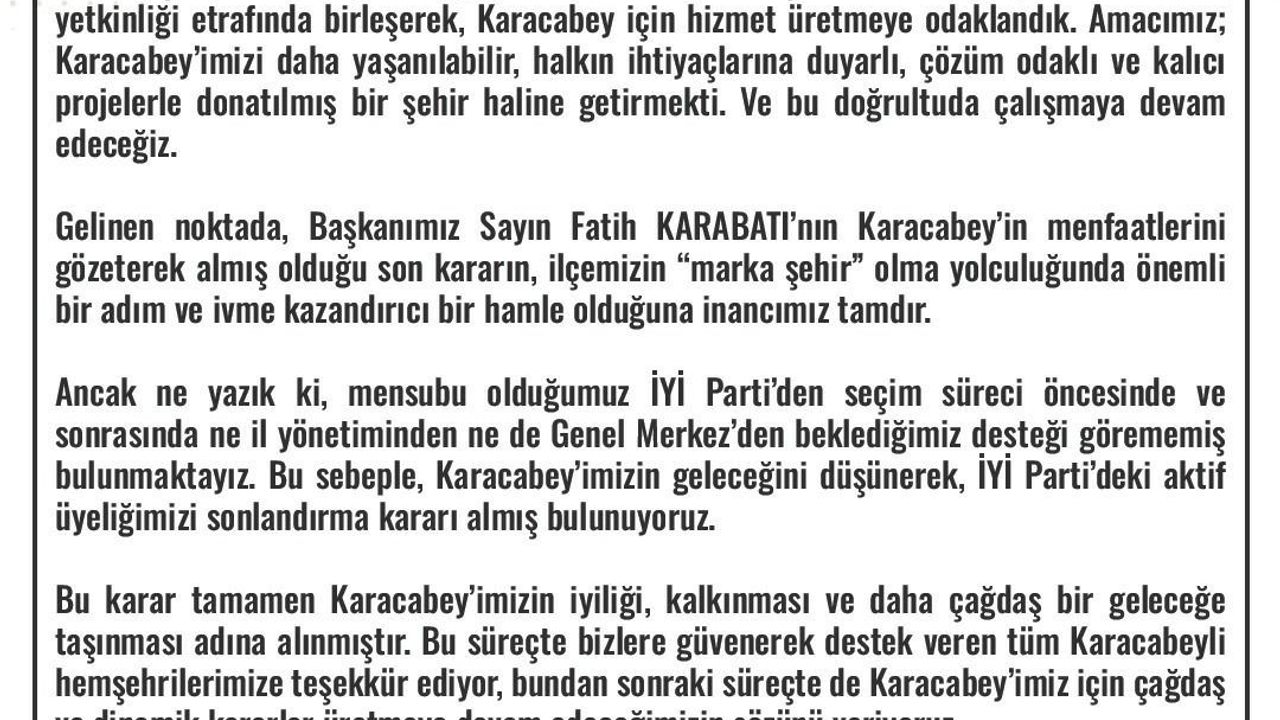 Karacabey Belediyesi İYİ Parti meclis üyeleri Hilmi Kuru, Süleyman Yörür, İlyas Aksoy ve Ahmet Karakuş, istifa kararının Karacabey Belediye Başkanı Fatih Karabatı’nın "marka şehir" vizyonuna destek olmak ve ilçenin menfaatlerini korumak amacıyla alındığını belirtti.