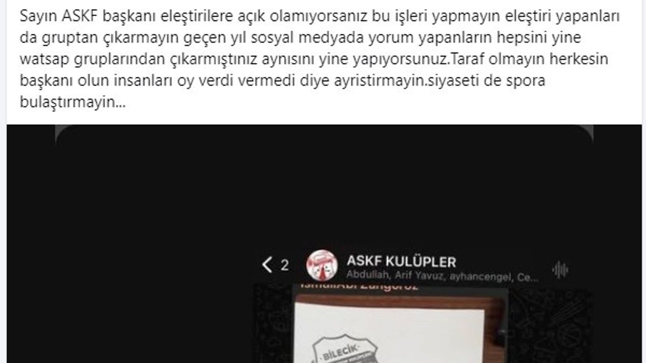 Edebali Spor Kulüp Başkanı aynı zaman da Bilecikspor ve 1299 Bilecik Kulübü yönetici Osman Topçu ise, "Makam, mevkii, unvan bunların hepsi cekettir. Ceketi asıp bir yere gittiğinizde arkada sadece insanlığımız kalır. Sayın ASKF başkanı eleştirilere açık olamıyorsanız bu işleri yapmayın, eleştiri yapanları da gruptan çıkarmayın. Geçen yıl sosyal medyada yorum yapanların hepsini yine WhatsApp gruplarından çıkarmıştınız ve aynısını yine yapıyorsunuz. Taraf olmayın herkesin başkanı olun insanları oy verdi vermedi diye ayrıştırmayın. Siyaseti de spora bulaştırmayın" dedi.