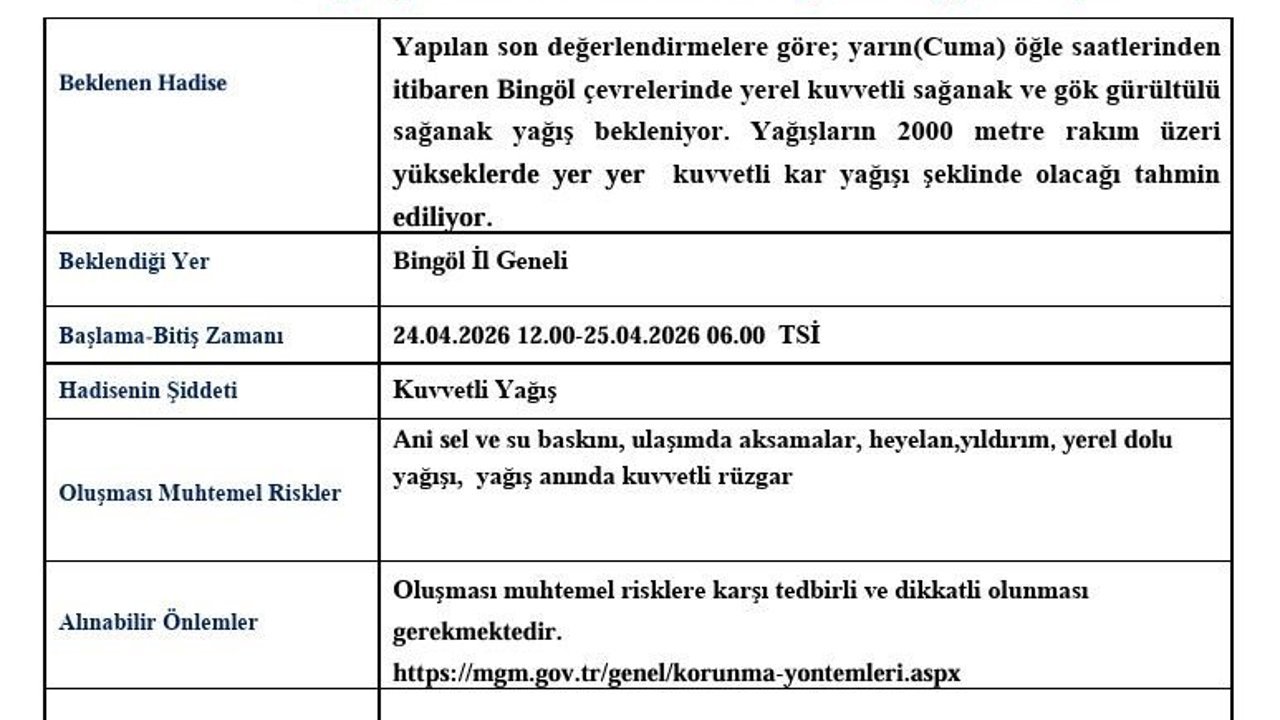 Meteoroloji 13. Bölge Müdürlüğü'nden yapılan açıklamada, 'Yapılan son değerlendirmelere göre; yarın (Cuma) öğle saatlerinden itibaren Bingöl çevrelerinde yerel kuvvetli sağanak ve gök gürültülü sağanak yağış bekleniyor. Yağışların 2000 metre rakım üzeri yükseklerde yer yer kuvvetli kar yağışı şeklinde olacağı tahmin ediliyor' denildi.
