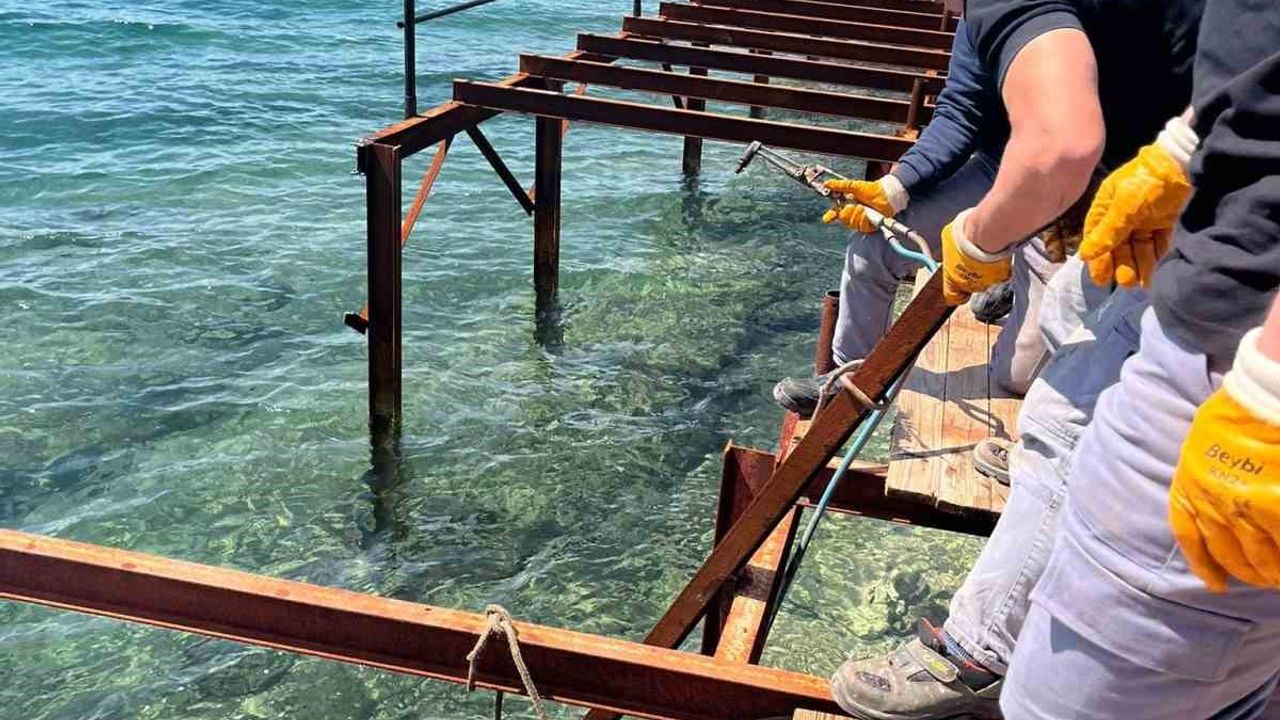 Muğla’nın Bodrum ilçesinde kaçak yapılarla mücadele sürerken, bir siteye ait kaçak iskele de belediye ekipleri tarafından söküldü.