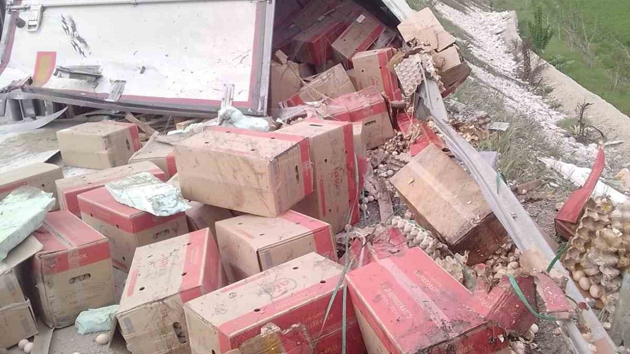 Bolu’da kontrolden çıkan yumurta yüklü tır devrildi. Kazada sürücü yaralanırken, tırın dorsesindeki yüzlerce yumurta kolisi yola saçıldı.