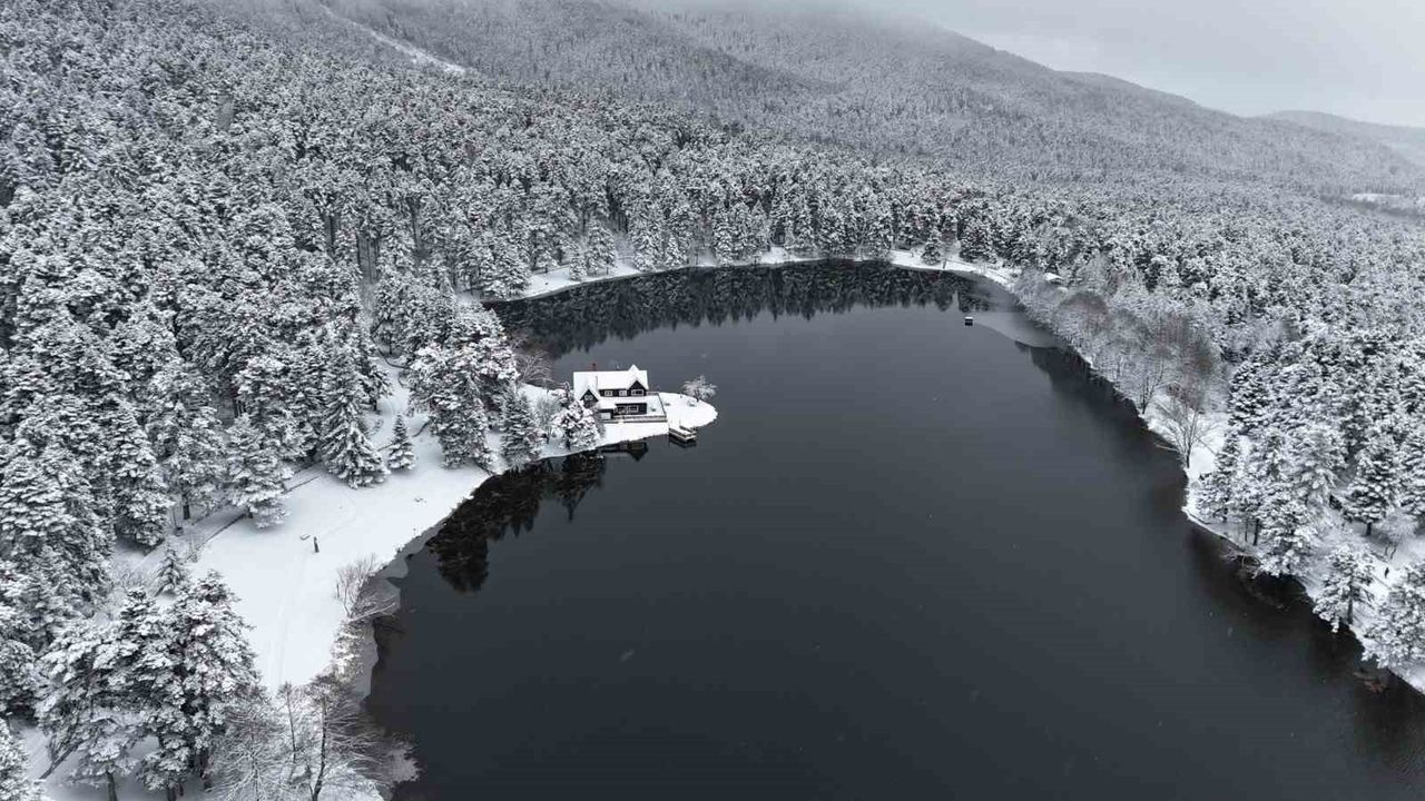 Bolu kent merkezine yaklaşık 13 kilometre uzaklıkta bulunan ve her mevsim yerli ve yabancı turistlerin uğrak noktası olan Gölcük Tabiat Parkı'nda, etkili olan kar yağışı sonrası seyrine doyumsuz manzaralar oluştu. Hava sıcaklığının sıfırın altına düştüğü bölgede, gölün çevresini saran çam ormanları ve simge haline gelen Devlet Konukevi tamamen beyaza büründü. 'Beyaz gelinliğini' giyen tabiat parkı, havadan dron ile görüntülendi. Ortaya çıkan kartpostallık manzaralar, görenleri hayran bıraktı.