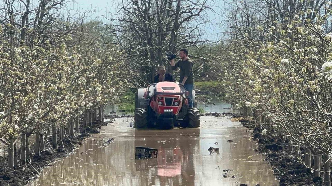 Armut bahçesine ilaçlama yapan üretici Turgay Koç ise yaşadıklarına zorluğa dikkati çekerek, 'Traktörlere, bize, çiftçiye, meyve ağaçlarına yazık. 9 dönüm armut bahçemin büyük bölümü su altında. Bir hafta 10 gün su çekilmezse kurayacak. Önümüzdeki günler de yağışlı görünüyor, çaresisiz' diye konuştu.