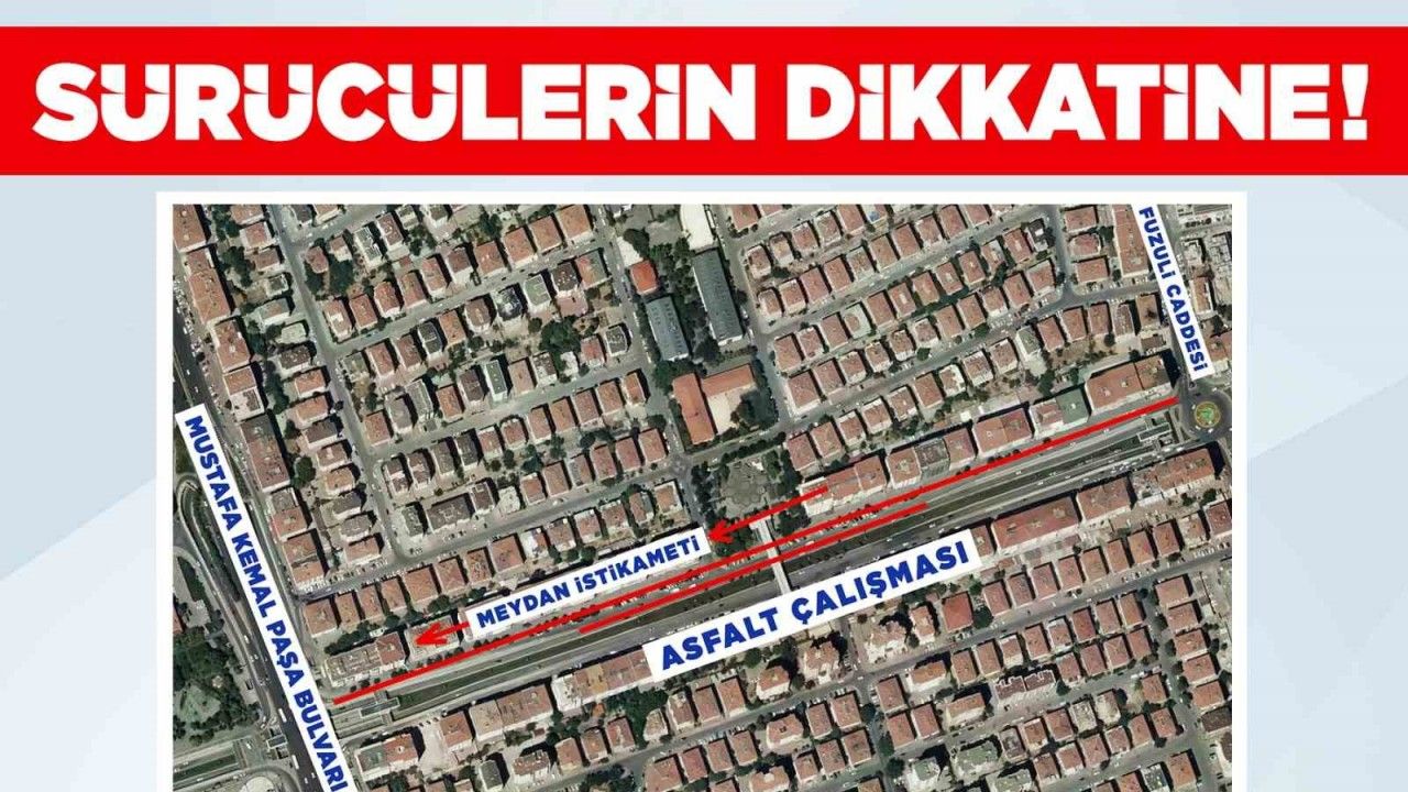 "Fen İşleri Daire Başkanlığı tarafından yapılan çalışmalar kapsamında, Sivas Caddesi’nin Fuzuli Kavşağı ile Mustafa Kemal Paşa Bulvarı arası kesiminde asfalt yenileme çalışmaları yapılacaktır. Çalışmalar 23.05.2025 Cuma günü saat 17.00’den itibaren başlanacak olup aynı gün akşam 21.00 itibari ile yolun meydan gidiş istikameti taşıt trafiğine kapanacaktır. Alternatif güzergâhları kullanmanız önemle rica olunur."