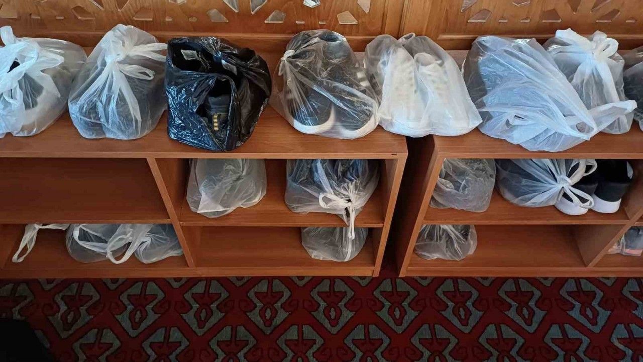 Adana Sabancı Merkez Camii’ne gelen vatandaşlar, hem hijyene uymak hem de muhtemel hırsızlıklara karşı ayakkabılarını poşete koyup içeride yer alan raflara yerleştiriyor.