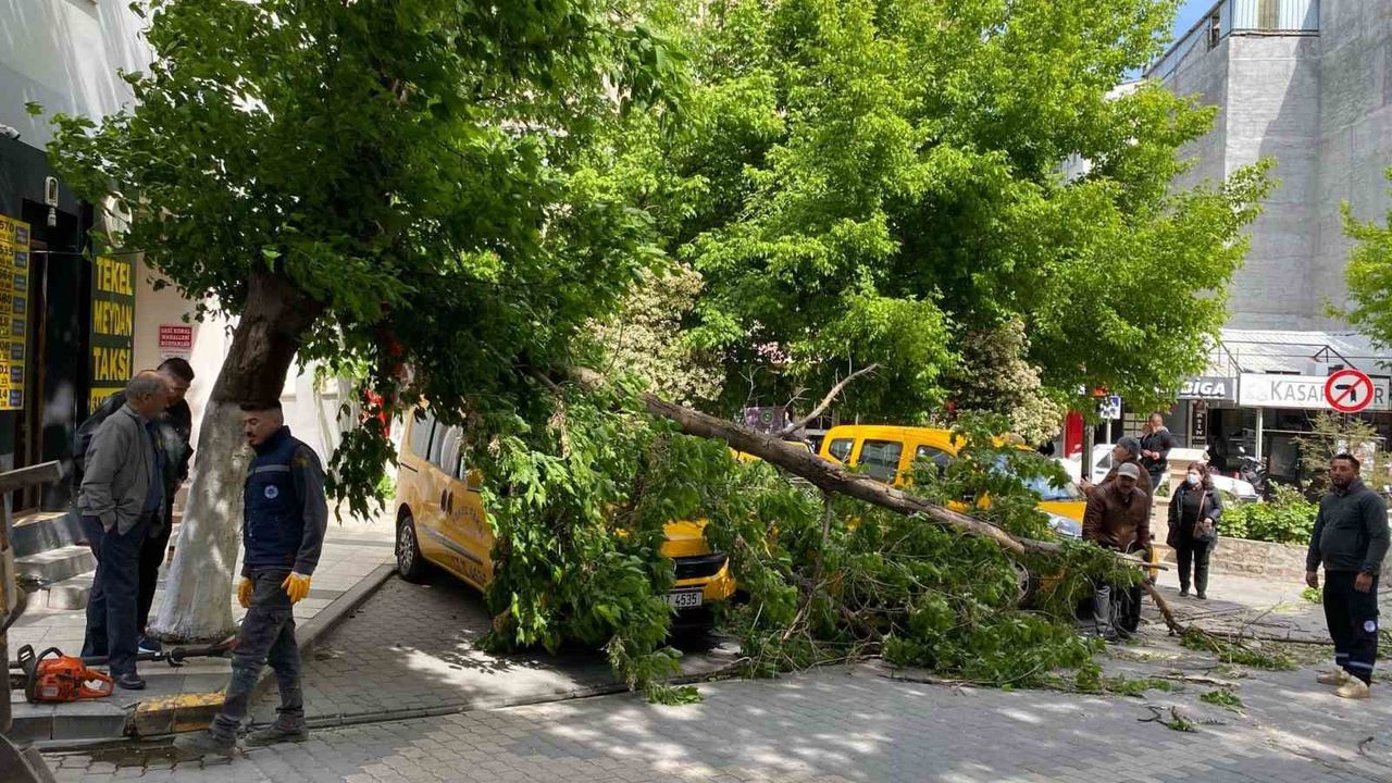 Çanakkale’de fırtınada kırılan ağaç dalı taksi durağında park halindeki 3 taksinin üzerine düştü. Olayda şans eseri yaralanan olmazken, araçlarda maddi hasar oluştu.
