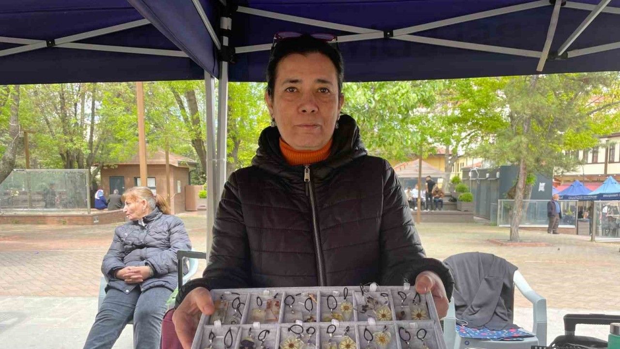 Eskişehir Odunpazarı Belediyesi Kadın El Sanatları Pazarı’nda el emeği ürünlerini satan Nurgül Bozkurt, canlı çiçekleri epoksi reçine kullanarak hazırladığı özgün kolyeleriyle hem yerli hem de yabancı turistlerin beğenisini topluyor. Nurgul Bozkurt’un hassas ölçümlerle hazırladığı epoksi karışımına özenle yerleştirdiği, önceden kurutulmuş rengârenk çiçeklerin her biri kolyeye dönüşüyor. Bozkurt, kolyelerin yapım sürecini anlatırken, "Malzemeleri hassas tartıda ölçerek karıştırıyorum. Kalıba döktükten sonra önceden kuruttuğum çiçekleri yerleştiriyorum. Ertesi gün ikinci dökümü yapıyorum ve 24 saat sonra kolye hazır hale geliyor" ifadelerini kullandı.