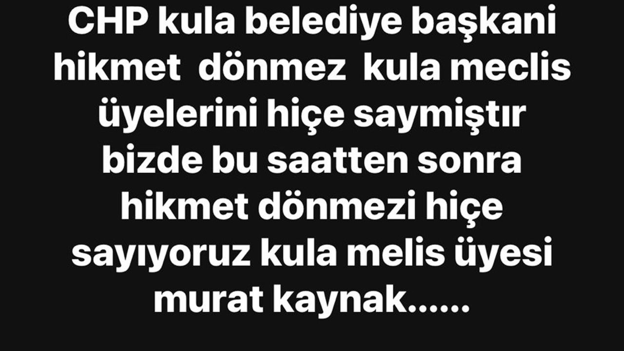 Öte yandan, kendi partisinin meclis üyesi tarafından hedef alınan CHP’li Kula Belediye Başkanı Hikmet Dönmez’in yaşanan gelişmelere karşı herhangi bir açıklamada bulunmaması dikkat çekti.