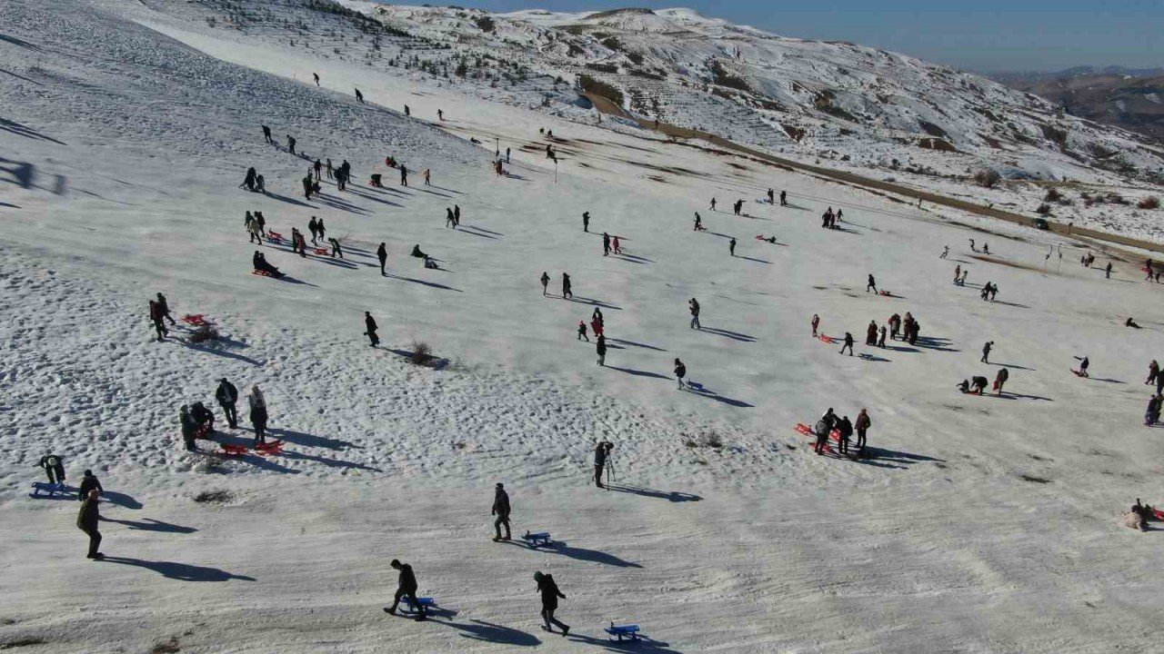 Elazığ’ın Sivrice ilçesinde göl manzarasıyla dikkati çeken Hazarbaba Kayak Merkezi’nde çocuklar sömestir tatilinin son gününde karın keyfini çıkardı.