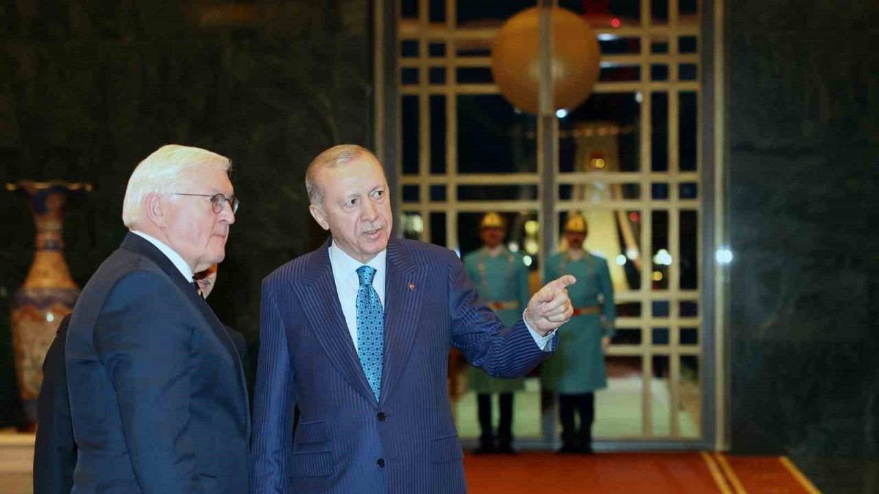 Cumhurbaşkanı Recep Tayyip Erdoğan, Almanya Cumhurbaşkanı Frank-Walter Steinmeier ile bir araya geldi. Cumhurbaşkanı Erdoğan, Steinmeier’i Cumhurbaşkanlığı Külliyesi’nin giriş kapısında karşıladı. Erdoğan ve Steinmeier, merdivenlerde Türkiye ve Almanya bayrakları önünde fotoğraf çektirdi. Erdoğan, mevkidaşı Steinmeier ile gerçekleştireceği ikili görüşme ve heyetler arası çalışma yemeğinin ardından ortak basın toplantısı düzenleyecek.