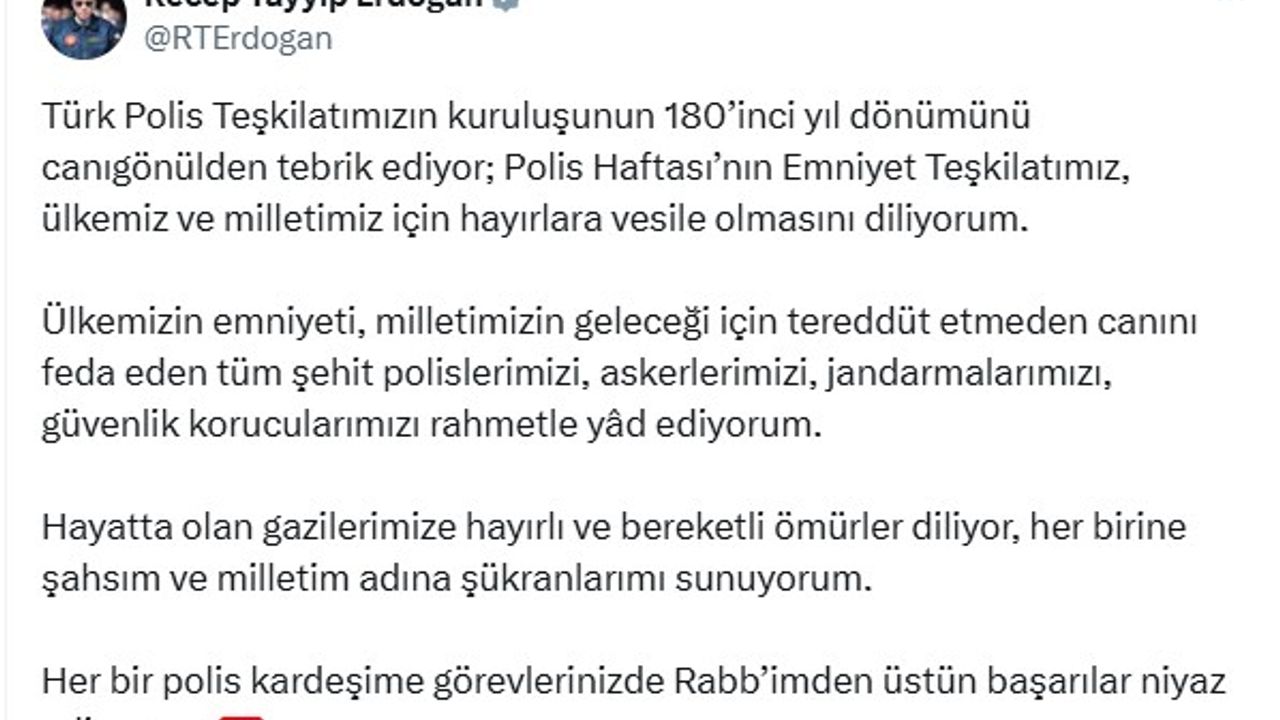 Cumhurbaşkanı Recep Tayyip Erdoğan, "Türk Polis Teşkilatımızın kuruluşunun 180’inci yıl dönümünü canıgönülden tebrik ediyor, Polis Haftası’nın Emniyet Teşkilatımız, ülkemiz ve milletimiz için hayırlara vesile olmasını diliyorum" dedi.